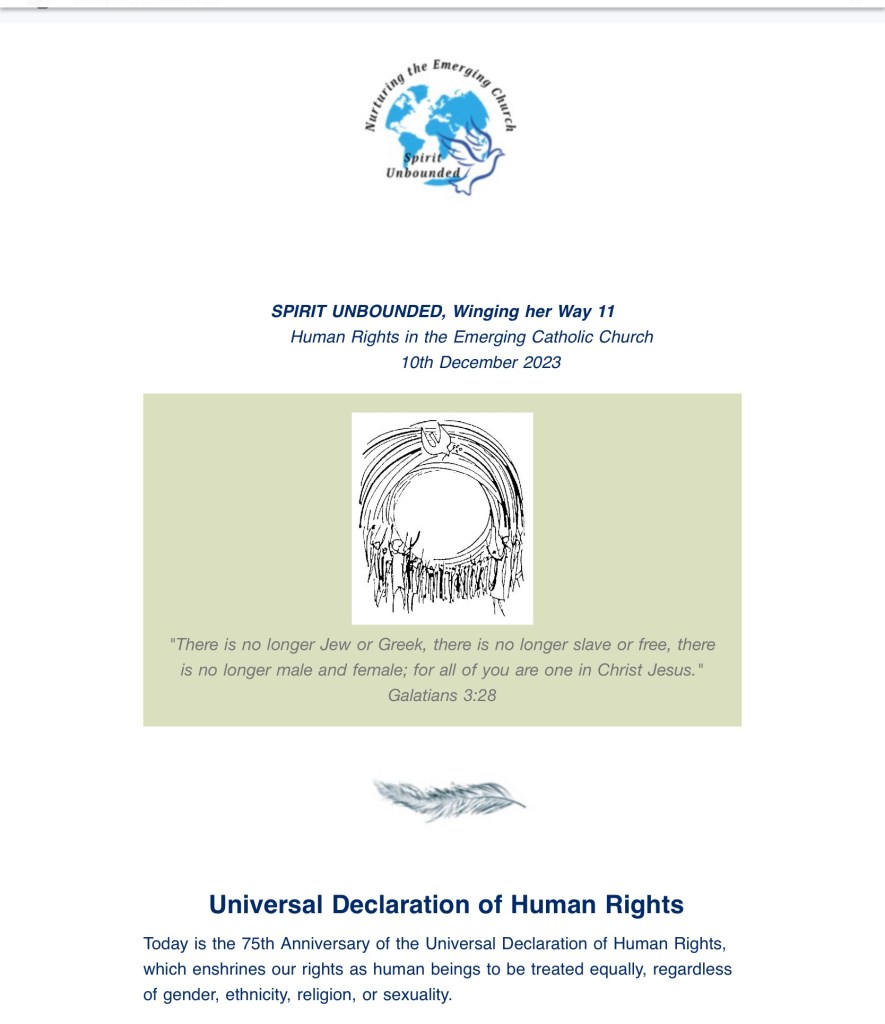 Allgemein Wake-up Call Date: 11 Dec 2023Author: Max Stetter 0 Comments SPIRIT UNBOUNDED, Winging her Way 11 Human Rights in the Emerging Catholic Church 10th December 2023“There is no longer Jew or Greek, there is no longer slave or free, there is no longer male and female; for all of you are one in Christ Jesus.”Galatians 3:28This statement also encapsulates everything that Spirit Unbounded stands for, upholding our rights, not only as part of the human family, but as disciples of Jesus Christ. As Jesus said:“If you abide in my word, you are truly my disciples, and you will know the truth, and the truth will set you free.” John 8:31-32A humorous take on the Catholic Church and Human RightsGet ready to blow out the candles on the 75th birthday cake of the Universal Declaration of Human Rights (UDHR) this December! 🎂 International Human Rights Day, celebrated on December 10th each year, marks this epic milestone in the quest for world peace, justice, and sustainable development. It’s like the global birthday party for everyone’s inalienable rights.But hold on to your mitres! The Holy See, the big cheese in the Catholic Church, isn’t exactly RSVPing to all of the Human Rights Conventions approved by the United Nations (UN). Despite having a VIP seat at the UN table, the Holy See has been a bit picky about adopting and ratifying these conventions. Catholics might be scratching their heads, wondering what the Holy See’s deal is at the UN. Find out about it here.Now, onto some holy controversy! The Holy See has given a holy nod to some international treaties but took some criticism for not getting on board with others. For instance, they’re not accepting the Convention on the Elimination of All Forms of Discrimination against Women (CEDAW) and haven’t fully embraced the Convention on the Rights of the Child (CRC). Why the cold shoulder? Turns out, it’s because these conventions might step on the toes of certain church teachings that are looking a bit outdated. Historians Helen Bond and Joan Taylor spill the holy tea on this.Let’s dive into the holy hotspots of tension:Freedom of Conversion: Changing religions? The UDHR is all for it, but not the Catholic Church – if you’re leaving the party! – they’ll not be handing out permission slips any time soon.Women’s Rights: The Catholic Church’s take on women’s roles doesn’t exactly sync with the gender equality proclaimed in the UDHR. Ban on women’s ordination? That’s a no-go for some critics – misogyny’s the only party in town for some party-goers.LGBTQ+ Rights: The Church’s conservative stance on sexual orientation clashes with the UDHR’s anti-discrimination playlist.Reproductive Rights: Contraception and abortion are touchy subjects where church doctrine meets UDHR recognition.Now, for the grand finale! The Holy See’s reluctance to go all-in on the UDHR is like trying to keep control of the remote. It’s a power move, protecting the patriarchy and hanging on to tradition. Add in some clericalism, hierarchical hurdles, and a sprinkle of historical and contemporary scandals, and you’ve got the Holy See doing the limbo under the bar of human rights standards.Professor Mary McAleese, the two-term, ex-president of Ireland, isn’t mincing words. In a keynote address, she’s calling out the Church for clinging to its outdated handbook. She’s saying, “Come on, Church, get with the times!” The biggest Christian Church in the world, the heavyweight champ NGO, and the only faith with UN VIP status are in a credibility crisis because they forgot to update the rulebook. Time for a Church glow-up, perhaps?So, will the Holy See blow out the candles and make a wish for a more just and non-discriminatory church and human rights-friendly future? Only time will tell in this holy drama! It’s not just a birthday party—it’s a wake-up call for the Church to step into the 21st century.🕊️✨If you want to read more, here is another article hosted on our new blog.Maggie Conway (Co-Founder Spirit Unbounded)The effort to phase out fossil fuels took a leap forward at Cop28, with the decision of Colombia to formally endorse the call for a Fossil Fuel Non-Proliferation Treaty.Colombia will be the largest fossil fuel producer to date to endorse this treaty, which also has the support of The Vatican and the Laudato Si movement.Thanks to Michael Poland of The Fossil Fuel Non-Proliferation Treaty Initiative for keeping us updated about this exciting news.https://fossilfueltreaty.org/Howeverthe Saudi delegation has vetoed all mention of fossil fuels in any deal coming out of COP28 which could mean the end of progress. Prayers please. Teilen mit: Click to share on X (Opens in new window) X Click to share on Facebook (Opens in new window) Facebook Like Loading...